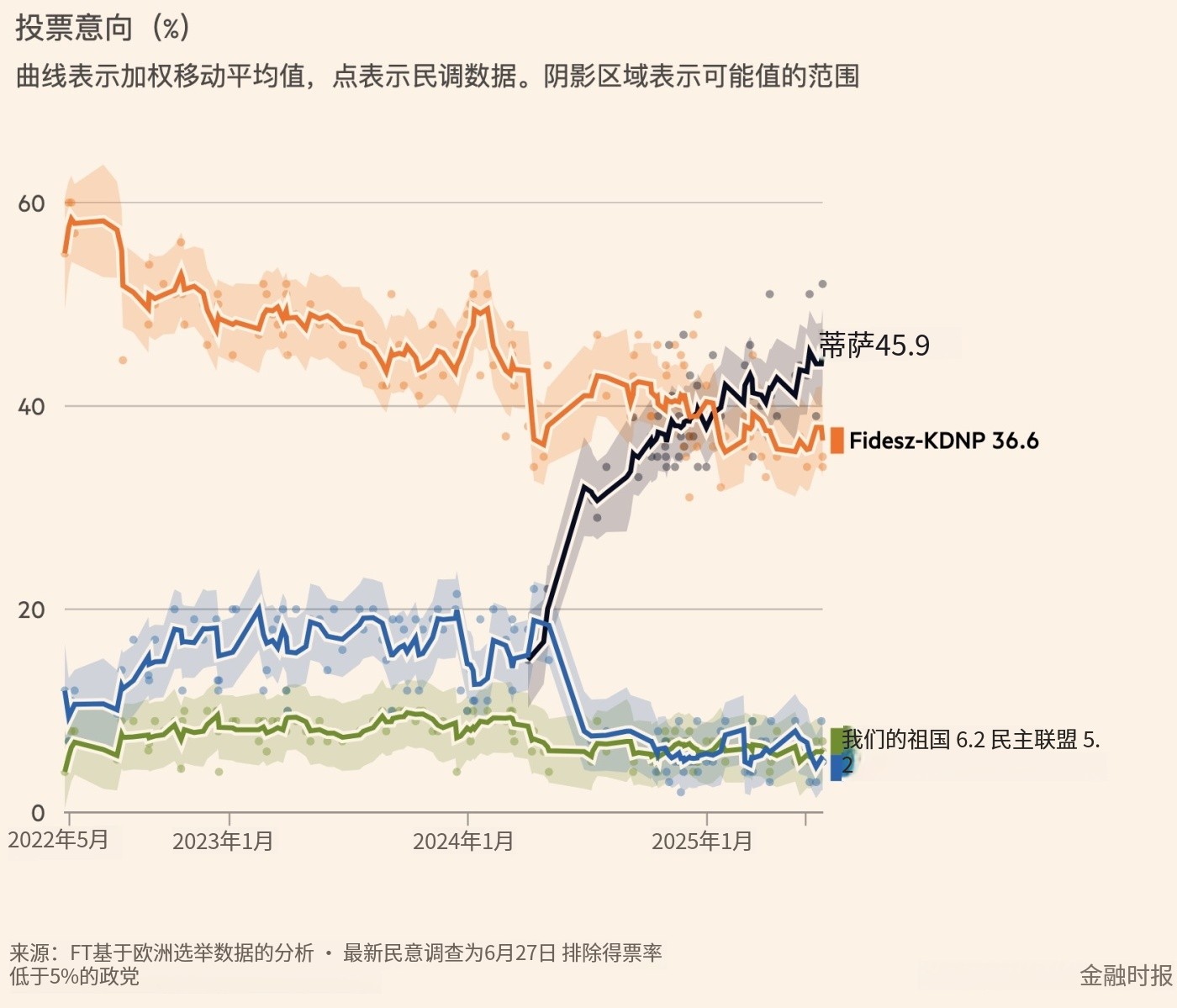 蒂萨党目前在民调中领先维克多·欧尔班领导的匈牙利执政党青年民主联盟(Fidesz),领先优势出现在明年匈牙利大选前夕