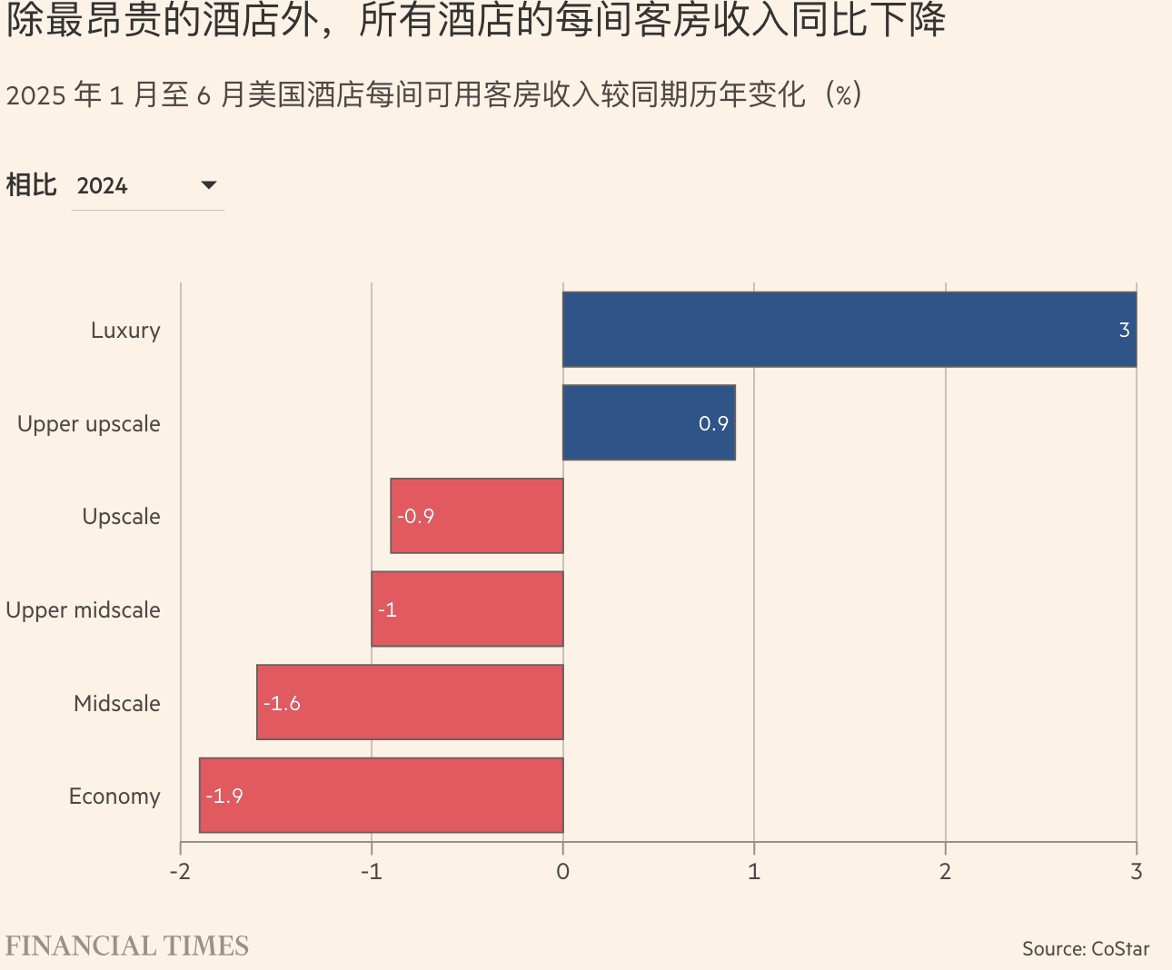 根据数据分析公司 CoStar 的数据显示,截至 7 月,美国豪华酒店的每可用房收入(RevPAR)这一酒店行业增长的关键指标上涨了 3%,而经济型和中档酒店的该指标则均下降了超过 1.5%。