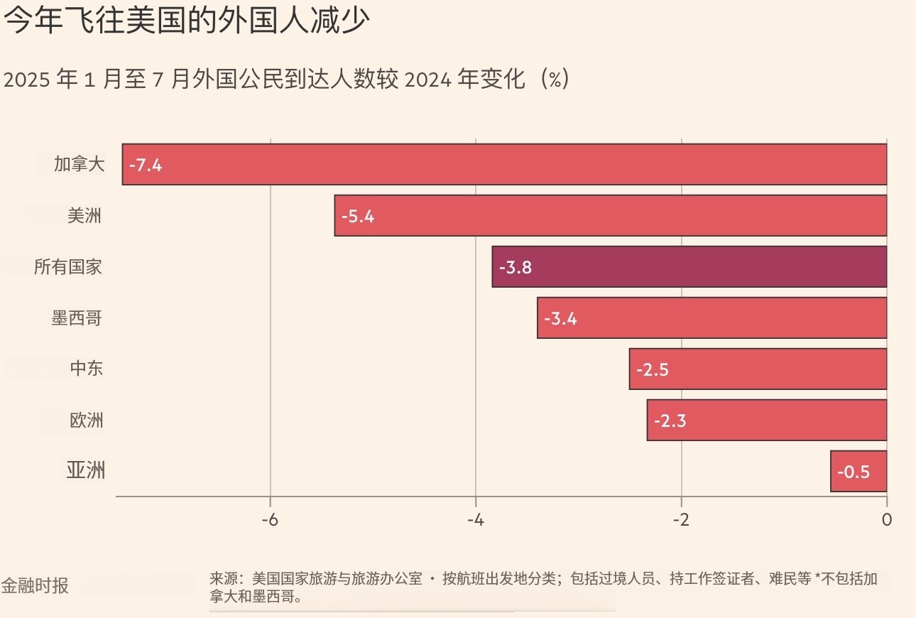 美国无疑正在迎来更少的外国游客。根据美国国家旅游办公室的数据,2025 年前七个月抵达美国机场的外国旅客数量较去年同期下降了 3.8%。