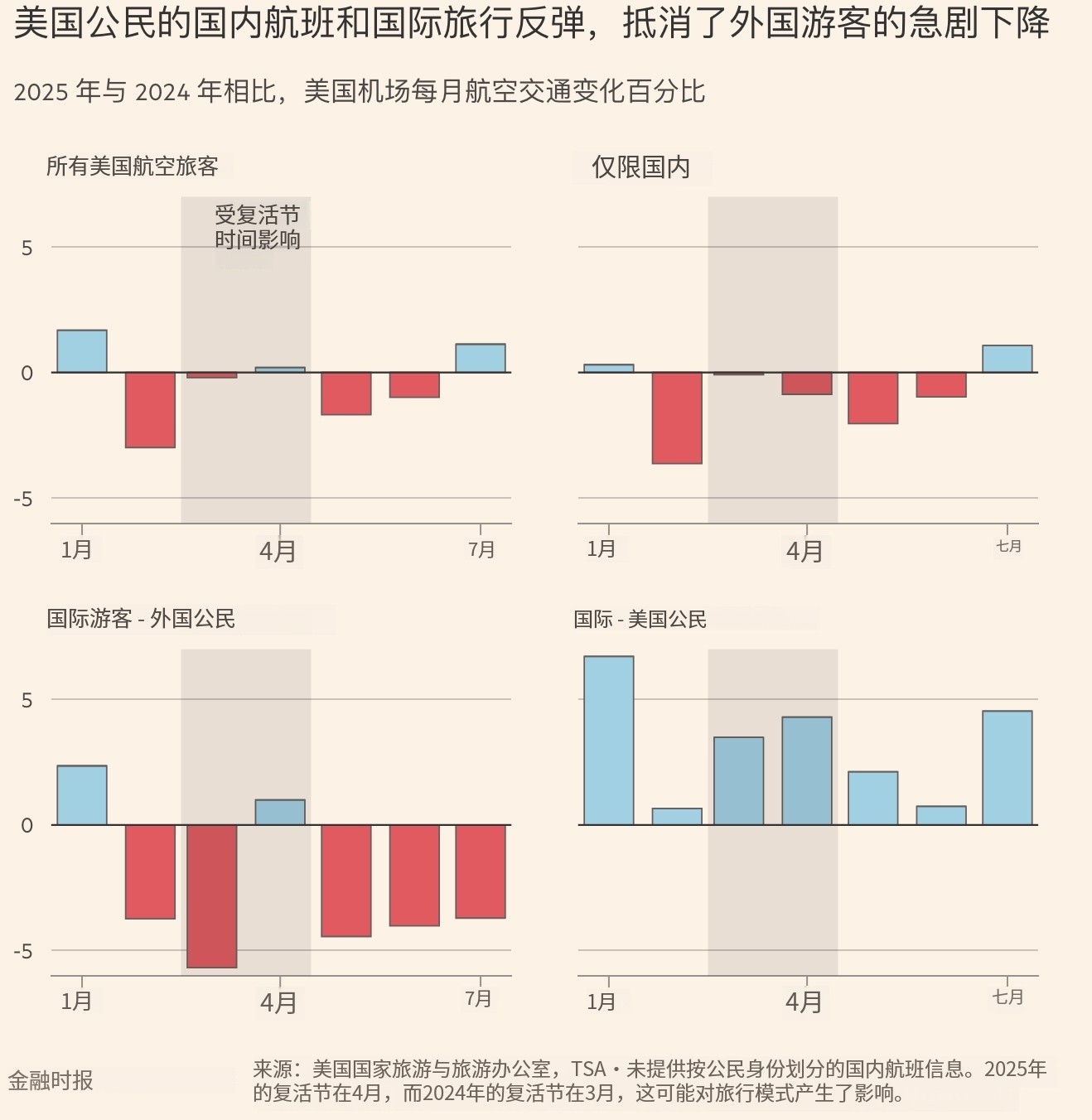 复苏主要得益于美国公民国际旅行需求强劲以及国内航班的回升——而今年几乎每个月,外国公民进出美国的航班数量均有所下降。