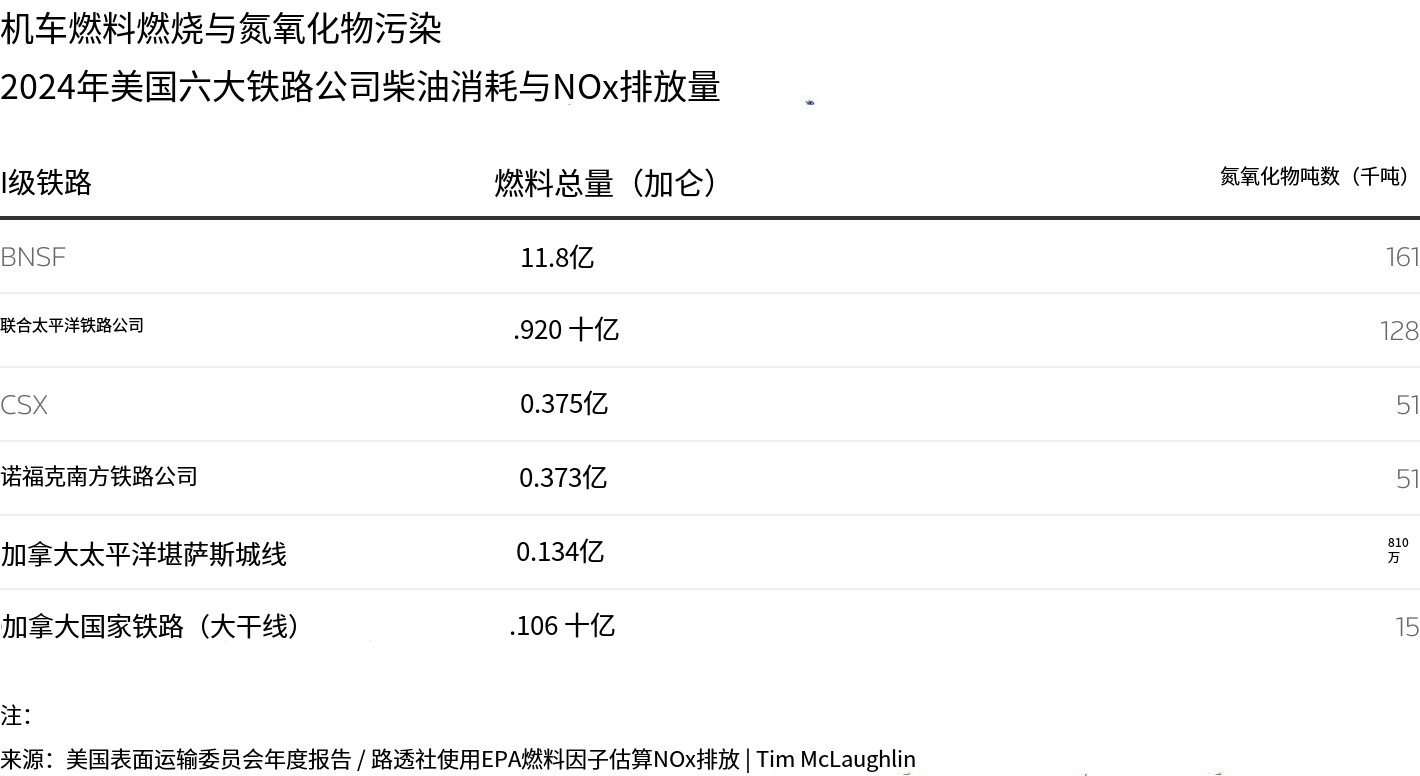 根据路透社对报告的年度燃料消耗数据与美国环保署 2023 年加权平均排放率的计算,美国铁路 2024 年共排放约 48.5 万吨氮氧化物,而美国燃煤电厂排放量为 45.2 万吨。