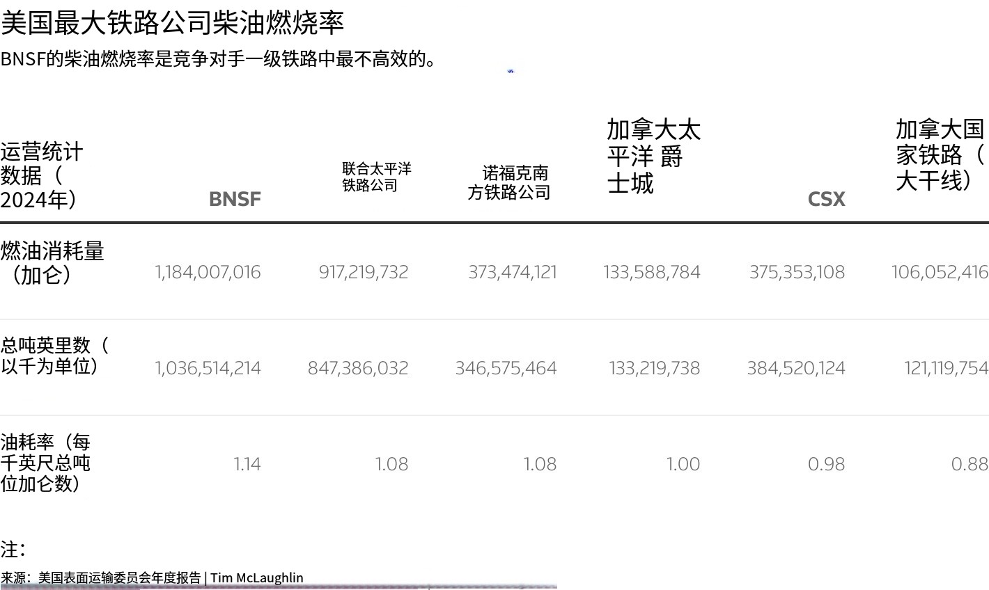 根据提交给美国地面运输委员会——该行业经济监管机构的铁路运营统计数据,BNSF 的燃油经济性在全国六大主要铁路公司中表现最差。