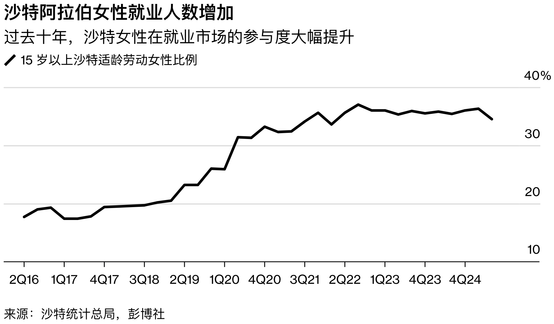 与此同时,沙特女性在职场上的状况发生了巨大变化。过去七年间,沙特王国宣布了一系列改革,允许女性在无需男性同意的情况下创办企业并独立出行,如今许多女性管理私募股权基金、进行股票交易并在工厂工作。